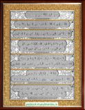Серебрянные шамаили, созданные мастерами "Галереи благолепия" это дорогие и благородные панно, выполненные вручную из цельнолистового серебра повышенной 960 пробы, а также покрыты позолотой 750 пробы и украшены изумрудами. Наши шамаили могут послужить роскошным подарком для уважаемого мусульманина и стать настоящей семейной реликвией, передаваемой по наследству.