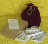Комплект из 91 кости для игры в домино с цветными точками в двойном мешочке из красного бархата.