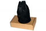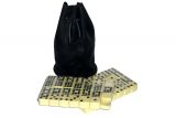 Комплект из 55 костей для игры в домино с черными точками и шариком для перемешивания на каждой единице в кожаном мешочке черного цвета.