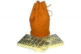 Комплект из 55 костей для игры в домино с черными точками и шариком для перемешивания на каждой единице в кожаном мешочке черного цвета.