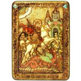 Инкрустированная аналойная икона Чудо святого Георгия о змие (21*29 см, Россия) на натуральном мореном дубе в подарочной коробке
