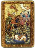 Инкрустированная аналойная икона Чудо вмч. Димитрия Солунского о царе Калояне (21*29 см, Россия) на натуральном мореном дубе в подарочной коробке