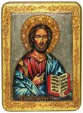 Инкрустированная аналойная икона Господь Вседержитель (21*29 см, Россия) на натуральном мореном дубе в подарочной коробке