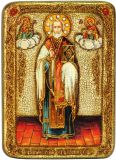 Инкрустированная аналойная икона Святитель Николай, архиепископ Мир Ликийский (Мирликийский), чудотворец (21*29 см, Россия) на натуральном мореном дубе в подарочной коробке