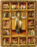 Инкрустированная Живописная икона Святитель Николай, архиепископ Мир Ликийский (Мирликийский), чудотворец с житийными сценами (54*44 см, Россия) на сакральном кипарисе в подарочной коробке