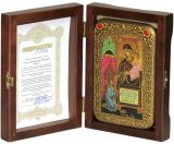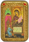 Инкрустированная настольная икона Образ Пресвятой Богородицы "Нечаянная Радость" (10*15 см, Россия) на натуральном мореном дубе, в подарочной коробке