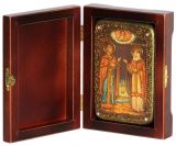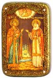 Инкрустированная настольная икона Петр и Февронья (10*15 см, Россия) на натуральном мореном дубе, в подарочной коробке