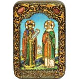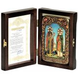 Инкрустированная настольная икона Петр и Февронья (10*15 см, Россия) на натуральном мореном дубе, в подарочной коробке