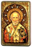 Инкрустированная настольная икона Святитель Николай, архиепископ Мир Ликийский (Мирликийский), чудотворец (10*15 см, Россия) на натуральном мореном дубе, в подарочной коробке