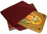 фронтажные грунты, выравнивающие лаки и темперные краски. Венец и поля иконы вручную украшены рельефным орнаментом и натуральным жемчугом. К каждой иконе прилагается номерное свидетельство с полной информацией о ней. Каждая икона поставляется в подарочной шкатулке.