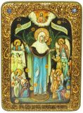 Инкрустированная подарочная икона Образ Божией Матери «Всех Скорбящих Радость с грошиками» (21*29 см, Россия) на натуральном мореном дубе в подарочной коробке