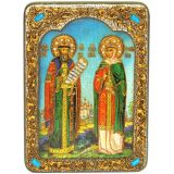 Инкрустированная рукописная икона Петр и Февронья (21*29 см, Россия) на натуральном мореном дубе в подарочной коробке