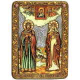 Инкрустированная рукописная икона Петр и Февронья (21*29 см, Россия) на натуральном мореном дубе в подарочной коробке