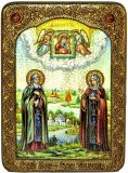 Инкрустированная рукописная икона Петр и Февронья (21*29 см, Россия) на натуральном мореном дубе в подарочной коробке