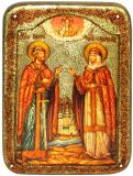 Инкрустированная рукописная икона Петр и Февронья (21*29 см, Россия) на натуральном мореном дубе в подарочной коробке