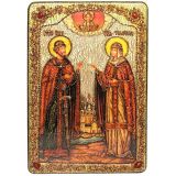 Инкрустированная рукописная икона Петр и Февронья (29*42 см, Россия) на натуральном мореном дубе в подарочной коробке