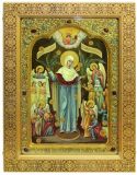 Пречистая Дева изображена на иконе во весь рост с распростертыми руками. Лик Ее несколько склонен в левую сторону. Верхняя одежда Богоматери темно-синего цвета, а нижняя — темно-красного. Глава Ее украшена золотистым нимбом и облечена в белое покрывало. Над Ней в облаках восседает Спаситель, держащий в левой руке св. Евангелие, а правой благословляющий. По сторонам образа находятся изображения ангелов и страждущих. Позади Богоматери изображены зеленеющие ветви. Икона в вышину около 10, а в ширину — около 7 вершков. Икона написана на натуральной деревянной доске, изготовленной из массива сакрального кипариса. Для оформления образа использованы специальные фронтажные грунты, выравнивающие лаки и темперные краски. К каждой иконе прилагается номерное свидетельство с полной информацией о ней. Размер тела иконы: 29х42 см - большой. Икона - лучший подарок, потому что, даря икону, мы выражаем человеку высшую степень христианской любви – пожелание спасения души.
