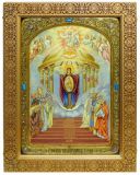 Икона Софии, Премудрости Божией (Киевская), занимает особое место в Русской Православной Церкви. На иконе изображена Божия Матерь и воплотившаяся из Нее Ипостасная Премудрость – Сын Божий. Под Премудростью, или Софией, разумеется Сын Божий, о Котором в Книге Притчей Соломоновых сказано: «Премудрость созда Себе Дом и утверди столпов седмь» (9, 1). В этих словах содержится указание на Христа, Сына Божия, Который в посланиях апостольских именуется «Божиею Премудростью» (1 Кор. 1, 30), а в слове «Дом» содержится указание на Пресвятую Деву Марию, от Которой воплотился Сын Божий. Изображение иконы свидетельствует об исполнении пророчества. На иконе Софии Киевской изображен храм и стоящая в нем Богоматерь в хитоне, с покрывалом на голове, под сенью, поддерживаемой семью столпами. Руки и ладони Ее распростерты, а стопы утверждены на серповидной луне. Божия Матерь держит Предвечного Младенца, благословляющего правой рукой, в левой руке Младенца держава. На карнизе сени начертаны слова из Книги Притчей: «Премудрость созда Себе Дом и утверди столпов седмь». Над сенью изображен Бог Отец и Бог Дух Святый. Из уст Бога Отца исходят слова: «Аз утвердих стопы Ея». По обе стороны изображены семь Архангелов с распростертыми крыльями, держащих знаки Своего служения в руках: с правой стороны – Михаил с пламенным мечом, Уриил – с молнией, опущенной вниз, Рафаил – с алавастром мира; с левой стороны – Гавриил с цветком лилии, Селафиил – с четками, Иегудиил – с царской короной и Варахиил – с цветами на белом плате. Под облаком с серповидной луной, служащей подножием Богоматери, изображен амвон с семью ступенями (изображающий Церковь Божию на земле) со стоящими на них ветхозаветными тайнозрителями воплощения Премудрости – праотцами и пророками. На каждой из семи ступеней амвона надписи: вера, надежда, любовь, чистота, смирение, благость, слава. Семь ступеней амвона утверждаются на семи столпах, на которых начертаны взятые из Апокалипсиса изображения и их объяснения. Икона написана на натуральной деревянной доске, изготовленной из массива сакрального кипариса. При окончательном оформлении образа использовались специальные фронтажные грунты, выравнивающие лаки и темперные краски. Венец и поля иконы вручную украшены рельефным орнаментом. К каждой иконе прилагается номерное свидетельство с полной информацией о ней. Размер тела иконы: 29х42 см - большой.