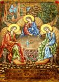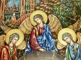 Образ Троицы — не только воплощение Триединого Божества, но и образ веры, надежды и любви. На иконе изображен бытийный сюжет, когда к древнему старцу Аврааму явились трое юношей-ангелов, и он вместе с супругой своей Саррой угощал их под сенью Мамврийского дуба, в тайне догадываясь, что в них воплотились три лица Троицы – Отец, Сын и Святой Дух.