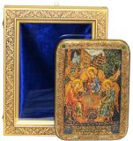 Данный киот выполнен из натурального дерева. Внутри киота оборудован мягкий ложемент, драпированный синим бархатом, аккуратно поддерживающий и фиксирующий икону. Рельефный орнамент рамки органично дополняет узор полей иконы.