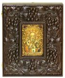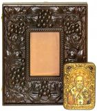 Основное назначение киота в возможности повесить икону. Дело в том, что доска, на которой написана икона, называется "телом иконы" и по канонам не может подвергаться механическим воздействиям. Т.е. ни прикрепить подвес на оборотную сторону, ни тем более сделать отверстия для гвоздя или шурупа в теле иконы нельзя. Икона сама по себе может только ставиться. Для того, чтобы иметь возможность повесить икону нужен киот. Данный киот предназначен для настольных икон, размерами 10*15 см. Внешние размеры киота составляют 32,5*26,5 см, что больше аналойной иконы. Это хорошо видно на фотографиях. Внутри киота оборудован мягкий ложемент, драпированный золотисто-желтым бархатом, аккуратно поддерживающий и фиксирующий икону. Рельефный орнамент рамки органично дополняет узор полей иконы. Упаковка: транспортная картонная коробка. Наименование: Киот резной из мореного дуба для настольной иконы Размер: 32,5 х 26,5 х 5 см Описание:
