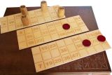 - Внутри шкатулки размещены два трея для боченков, - в процессе игры боченки выставляются в них по номерам, что облегчает отслеживание выпавших. Оба трея вынимаются из шкатулки и могут быть расположены как на её каркасе (как на фото), так и в любом удобном для игроков месте. Верхняя поверхность треев покрыты флоком, надежно защищающим пласти треев и боченки от царапин.