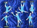 Набор из шести раскрашенных вручную цинковых миниатюр, представляющих яркие игровые моменты одной из самых любимых в нашей стране спортивной игры. Высота футболиста от бутс до головы 63-64 мм. Изначально фигуры разрабатывались как шахматные, но как показали продажи, в виде набора фигрок они более востребованы. Номера и фамилии игроков на футболки не нанесены, но легко могут быть нанесены покупателем с помощью темперных красок.