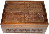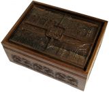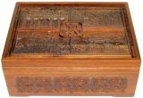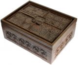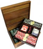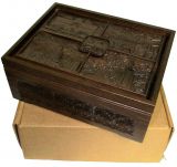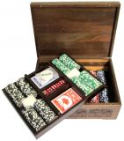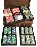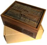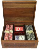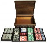 Это самый красивый на сегодняшний день наш набор с фишками для покера. На лицевой поверхности богатого дубового ларца вырезаны изображения красивейших архитектурных памятников города Москвы: здания Государственной Третьяковской галереи, ГУМа, Университета и вид на "Рабочего и Колхозницу". В его состав входят: