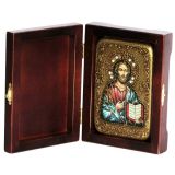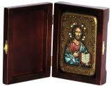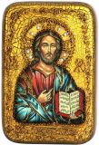 Инкрустированная настольная икона Господь Вседержитель (10*15 см, Россия) на натуральном мореном дубе, в подарочной коробке