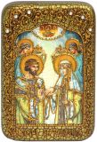 Инкрустированная настольная икона Петр и Февронья (10*15 см, Россия) на натуральном мореном дубе, в подарочной коробке