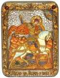 Инкрустированная подарочная икона Чудо святого Георгия о змие (15*20 см, Россия) на натуральном мореном дубе в подарочной коробке