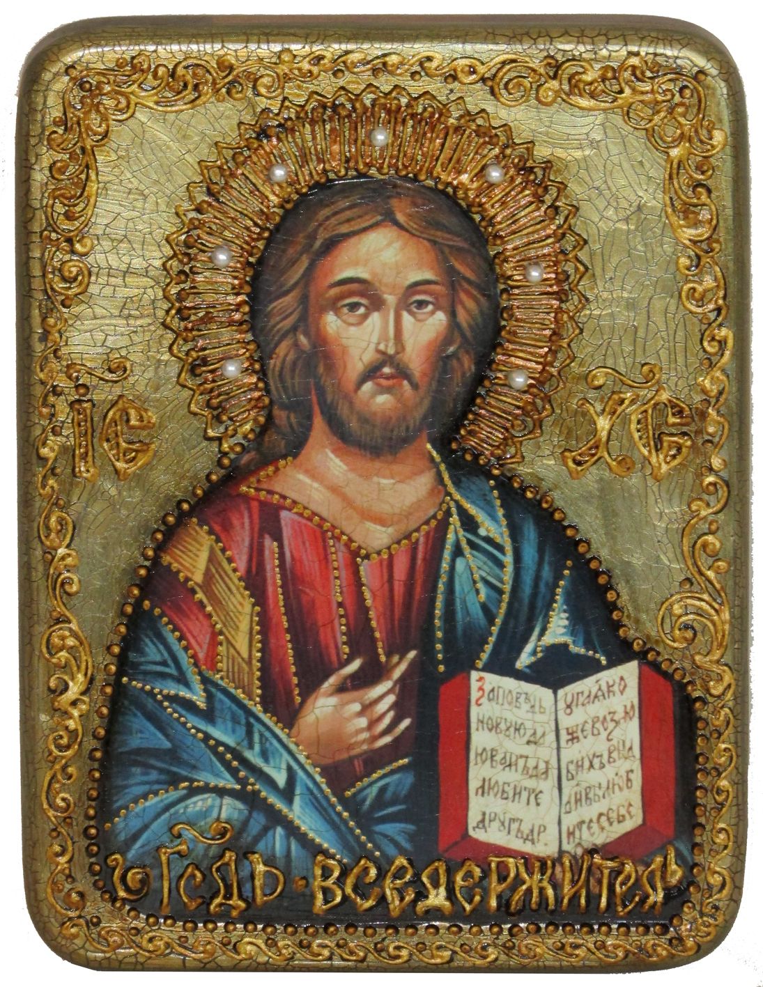 Инкрустированная подарочная икона Господь Вседержитель (15*20 см, Россия) на натуральном мореном дубе в подарочной коробке