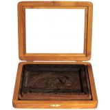 Икона выполнена из массива мореного дуба, покрыта льняным маслом и украшена янтарем. Киот выполнен из натуральной мореной березы, покрытой маслом.