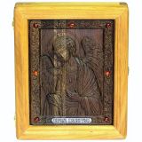 резная икона в подарок маме и дочери Ангела-Хранителя на натуральном мореном дубе, инкрустированная янтарем (18*23 см, Россия)