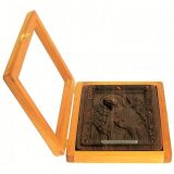 Икона выполнена из массива мореного дуба, покрыта льняным маслом и украшена янтарем. Киот выполнен из натуральной мореной березы, покрытой маслом.