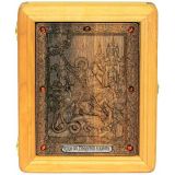 Резная икона в подарок сыну Чудо святого Георгия о змие на натуральном мореном дубе, инкрустированная янтарем (18*23 см, Россия)