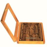 Икона выполнена из массива мореного дуба, покрыта льняным маслом и украшена янтарем. Киот выполнен из натуральной мореной березы, покрытой маслом.