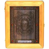 резная икона в подарок сыну Спас Нерукотворный на натуральном мореном дубе, инкрустированная янтарем (18*23 см, Россия)