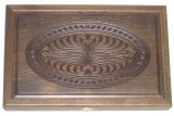 С внешней стороны на лицевой филенке вырезан древний восточный рисунок с двумя зеркальными витиеватыми узорами. На оборотной филенке вырезана доска для игры в шашки.