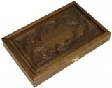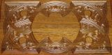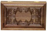 внешней стороны на лицевой филенке вырезан древний восточный рисунок со свободным полем по центру. Данная доска прекрасно подходит для персонализации путем включения логотипа компании или дарственной надписи в центр рисунка на лицевой филенке.