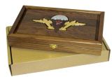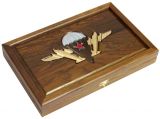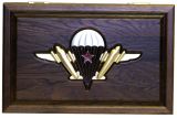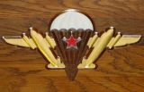 внешней стороны на лицевой филенке в массив мореного дуба внедрены металлические силуэты двух десантных самолетов, обрамляющих вырезанные в массиве стропы парашюта. Купол парашюта также как и самолеты отлит из цинкового сплава и в отличие от первых посеребрен (самолеты покрыты золотистой краской). В центре композиции расположена металлическая звезда, покрытая красной эмалью.