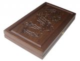 внешней стороны на лицевой филенке вырезан дракон в восточном стиле. На оборотной филенке вырезана доска для игры в шашки.