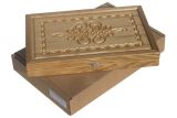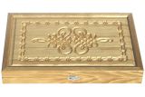 С внешней стороны на лицевой филенке вырезан древний восточный рисунок с двумя зеркальными витиеватыми узорами. Внутри рамки можно разместить логотип компании или дарственную надпись. На оборотной филенке вырезана доска для игры в шашки.