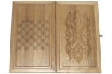 С внешней стороны на лицевой филенке вырезана виньетка в древневосточном стиле. На оборотной филенке вырезана доска для игры в шашки.