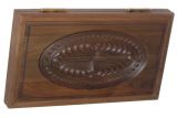 С внешней стороны на лицевой филенке вырезан стилизованный римский щит. На оборотной филенке вырезана доска для игры в шашки.