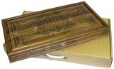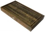 С внешней стороны на лицевой филенке вырезан стилизованный восточный рисунок.  Оборотная филенка с выгравированной доской для игры в шашки.