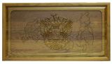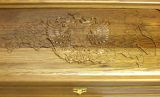 внешней стороны на лицевой филенке по центру вырезан двуглавый орел на фоне карты Российской Федерации с рельефными границами субъектов. На
