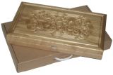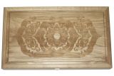 С внешней стороны на лицевой филенке вырезан псевдо русский орнамент с солнцем в середине композиции. Оборотная филенка гладкая.