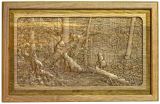 внешней стороны на лицевой филенке вырезана картина известного русского живописца Ивана Ивановича Шишкина "Утро в сосновом лесу".