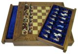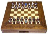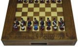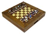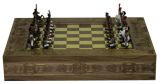 Этот эксклюзивный комплект - дань памяти русским воинам, положившим свои жизни на алтарь победы русского оружия над мощью наполеоновкой армады. Доска в данном наборе выполнена из массива черного горного дуба и украшена тематической резьбой по краю игрового поля. В правых углах игроков можно увидеть легко узнаваемые фигуры князя Кутузова и Наполеона Бонапарта, остальную площадь занимает изображения родов войск и вооружений каждой из сторон. Поле набрано из попеременно расположенных клеток темного (европейский орех) и светлого (американский клен) сортов шпона. Действующими лицами, - фигурами - выступают настоящие оловянные солдатики, отлитые и покрашенные вручную российскими мастерами. Фигурки убираются в выдвижные ящики (войска Наполеона в один, русские воины в другой). Для каждой фигуры предусмотрен отдельный мягкий ложемент. На противоположных боковых торцах доски по центру вырезаны вензеля глав противоборствующих государств, - Наполеона I и Александра I